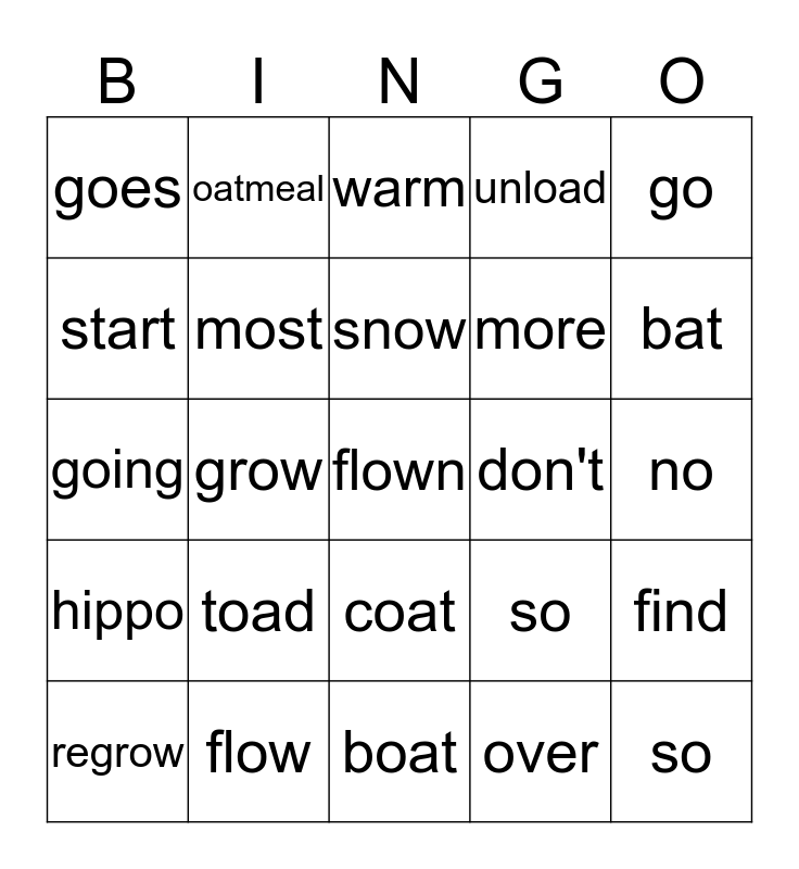 This bingo card has a free space and 28 words: find, food, more, over, start, warm, oatmeal, hippo, don't, regrow, going, unload, flow, boat, bat, told, toad, most, snow, coat, goes, load, so, grow, no, so, go and both.