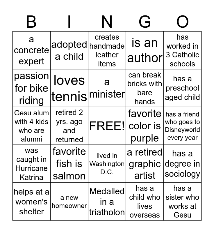 This bingo card has a free space and 24 words: favorite fish is salmon, a new homeowner, a minister, helps at a women's shelter, has worked in 3 Catholic schools, a concrete expert, passion for bike riding, adopted a child, favorite color is purple, lived in Washington D.C., can break bricks with bare hands, Gesu alum with 4 kids who are alumni, a retired graphic artist, has a degree in sociology, loves tennis, has a child who lives overseas, has a friend who goes to Disneyworld every year, creates handmade leather items, has a preschool aged child, retired 2 yrs. ago and returned, has a sister who works at Gesu, was caught in Hurricane Katrina, is an author and Medalled in a triatholon.