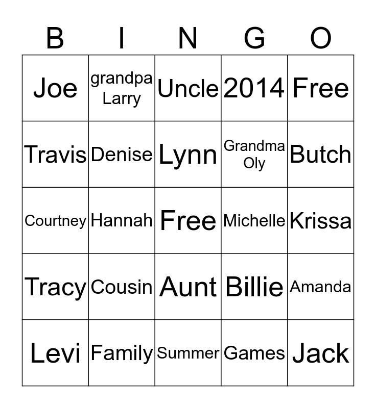 This bingo card has a free space and 24 words: Cousin, Family, Lynn, Levi, Free, Joe, Travis, grandpa Larry, Michelle, Aunt, Grandma Oly, Courtney, Billie, Amanda, Denise, Games, Krissa, Uncle, Butch, Hannah, Jack, Tracy, 2014 and Summer.