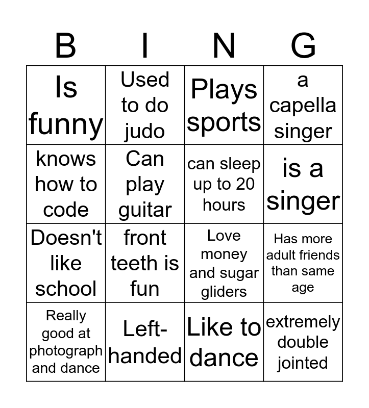 This bingo card has 16 words: Left-handed, Has more adult friends than same age, Plays sports, Is funny, Doesn't like school, Used to do judo, Love money and sugar gliders, Like to dance, knows how to code, Can play guitar, Really good at photograph and dance, a capella singer, front teeth is fun, is a singer, can sleep up to 20 hours and extremely double jointed.
