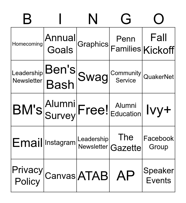 This bingo card has a free space and 33 words: ACAM, Attendee Lists, Alumni Survey, PWP, Email, Ben's Bash, Fall Kickoff, Privacy Policy, Annual Goals, Demographics, Swag, Graphics, Mission Statement, New Student SO, Alumni Education, QuakerNet, Canvas, BM's, Instagram, The Gazette, Leadership Newsletter, AW, Homecoming, Ivy+, ATAB, Speaker Events, Penn Families, Community Service, Leadership Newsletter, Facebook Group, Bylaws, AP and Event Follow-Up.