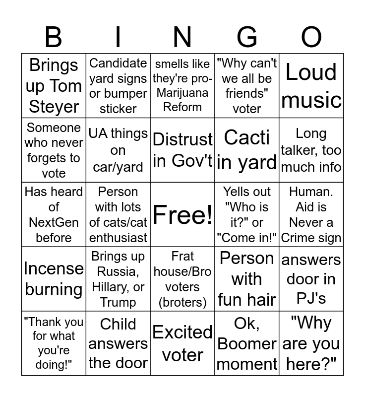 This bingo card has a free space and 44 words: Friendly Pet, "Why are you here?", "How did you get my info?", "Thank you for what you're doing!", Pride Flag, Ok, Boomer moment, smells like they're pro-Marijuana Reform, American Flag, Loud music, Child answers the door, "Why can't we all be friends" voter, Yells out "Who is it?" or "Come in!", Frat house/Bro voters (broters), Brings up Russia, Hillary, or Trump, Familiar face or a friend of friend, Excited voter, Asks who ur voting for/who to vote for, Has heard of NextGen before, Loud TV or Video Games, Long talker, too much info, Candidate yard signs or bumper sticker, Immediate no or door slam, yells at dogs/kids answering door, Brings up Tom Steyer, Brings up the 2016 Election, Human. Aid is Never a Crime sign, NRA or Don't Tread on Me sign/sticker, Person with a face piercing, Person with fun hair, Incense burning, Lots of plants, answers door in PJ's, "Young people will change the world!", Invites you inside, Person with lots of cats/cat enthusiast, Apathetic Voter, opinion on the candidates, Unique pets, Distrust in Gov't, Someone who never forgets to vote, Cacti in yard, doesn't know who to vote 4, UA things on car/yard and Grumpy.
