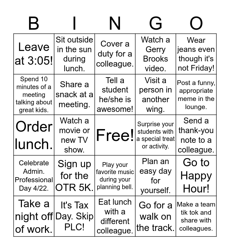 This bingo card has a free space and 24 words: Sign up for the OTR 5K., It's Tax Day. Skip PLC!, Tell a student he/she is awesome!, Take a night off of work., Wear jeans even though it's not Friday!, Leave at 3:05!, Spend 10 minutes of a meeting talking about great kids., Sit outside in the sun during lunch., Surprise your students with a special treat or activity., Play your favorite music during your planning bell., Visit a person in another wing., Order lunch., Plan an easy day for yourself., Go to Happy Hour!, Share a snack at a meeting., Go for a walk on the track., Send a thank-you note to a colleague., Cover a duty for a colleague., Post a funny, appropriate meme in the lounge., Watch a movie or new TV show., Make a team tik tok and share with colleagues., Celebrate Admin. Professional Day 4/22., Watch a Gerry Brooks video. and Eat lunch with a different colleague..