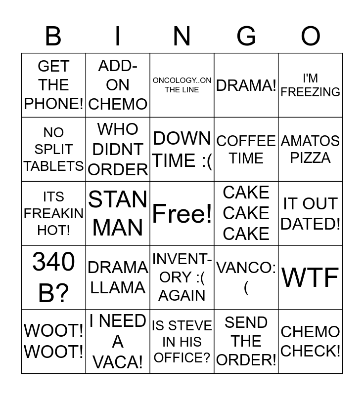 This bingo card has a free space and 29 words: WOOT! WOOT!, HEEATHEER!, STAN MAN, PILL SPLITTER, GET THE PHONE!, ONCOLOGY..ON THE LINE, WHO DIDNT ORDER, DRAMA LLAMA, CAKE CAKE CAKE, I NEED A VACA!, IT OUT DATED!, CHEMO CHECK!, IS STEVE IN HIS OFFICE?, SEND THE ORDER!, AMATOS PIZZA, SCHMITTY, INVENT-ORY :( AGAIN, 340 B?, I'M FREEZING, ITS FREAKIN HOT!, VANCO:(, CORN HOLE!!, COFFEE TIME, NO SPLIT TABLETS, DRAMA!, ADD-ON CHEMO, WTF, DOWN TIME :( and ITS about the PATIENT.