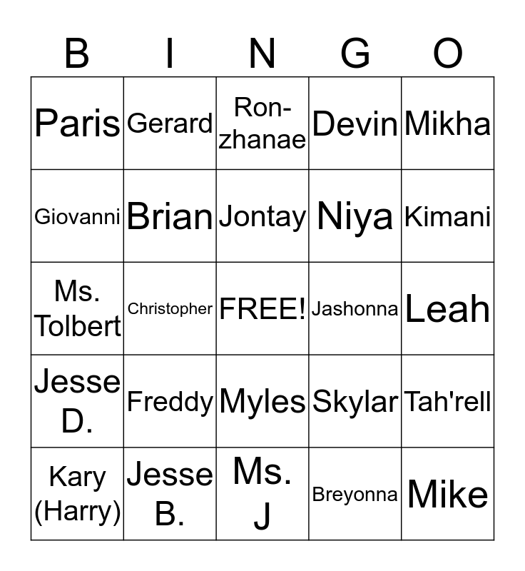 This bingo card has a free space and 24 words: Freddy, Jesse B., Jontay, Kary (Harry), Mikha, Paris, Giovanni, Gerard, Jashonna, Myles, Niya, Ms. Tolbert, Skylar, Tah'rell, Brian, Breyonna, Leah, Ron-zhanae, Kimani, Christopher, Mike, Jesse D., Devin and Ms. J.