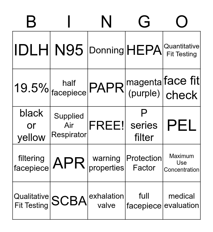 This bingo card has a free space and 24 words: APR, SCBA, PAPR, Qualitative Fit Testing, Quantitative Fit Testing, IDLH, 19.5%, N95, P series filter, warning properties, magenta (purple), black or yellow, Protection Factor, Maximum Use Concentration, half facepiece, full facepiece, PEL, Donning, face fit check, Supplied Air Respirator, medical evaluation, filtering facepiece, HEPA and exhalation valve.