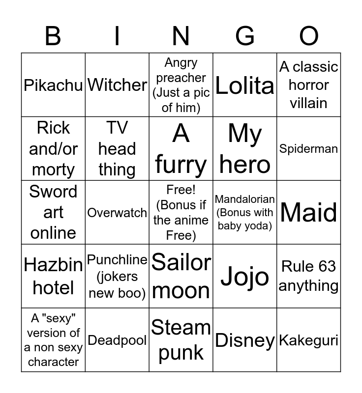 This bingo card has a free space and 24 words: Punchline (jokers new boo), Deadpool, A furry, A "sexy" version of a non sexy character, A classic horror villain, Pikachu, Rick and/or morty, Witcher, Mandalorian (Bonus with baby yoda), Sailor moon, My hero, Sword art online, Jojo, Rule 63 anything, TV head thing, Disney, Maid, Angry preacher (Just a pic of him), Spiderman, Overwatch, Kakeguri, Hazbin hotel, Lolita and Steam punk.