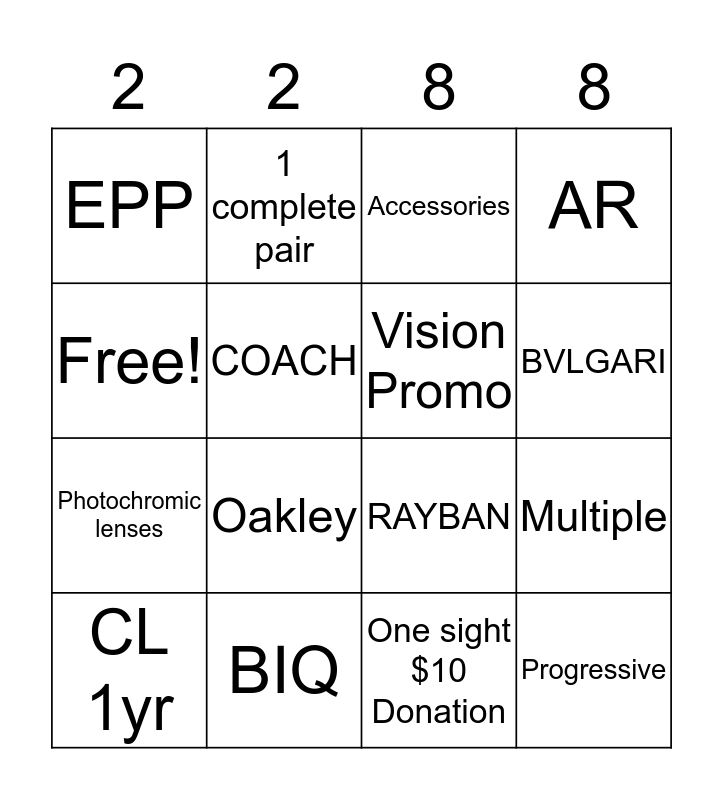 This bingo card has 16 words: BIQ, Multiple, Accessories, EPP, Photochromic lenses, 1 complete pair, RAYBAN, One sight $10 Donation, Free!, COACH, CL 1yr, AR, Oakley, BVLGARI, Vision Promo and Progressive.