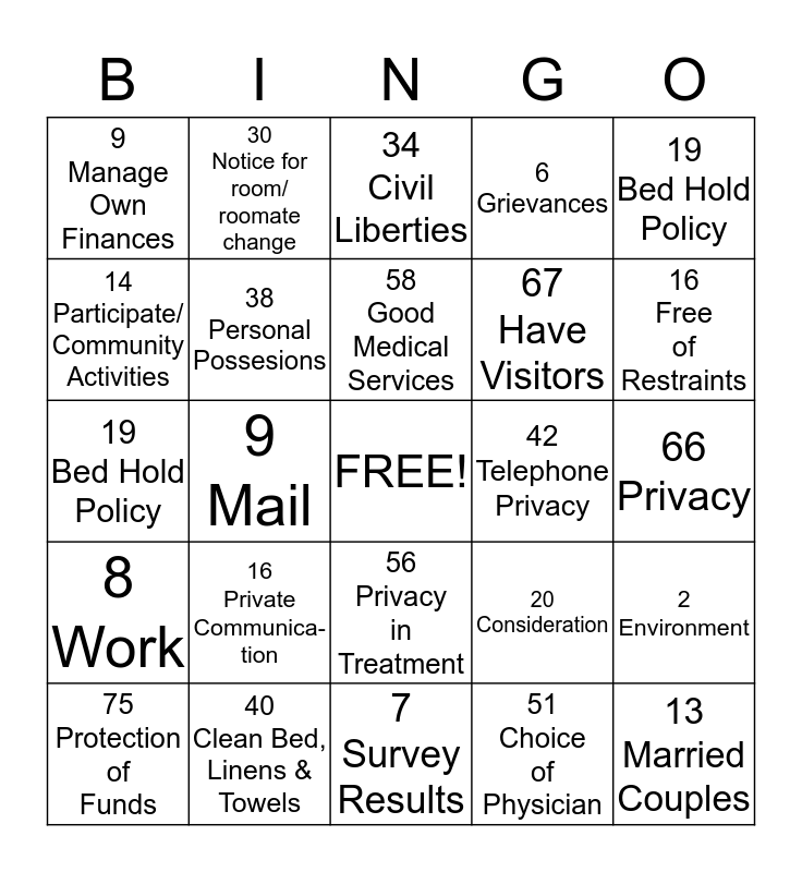 This bingo card has a free space and 24 words: 16 Private Communica- tion, 40 Clean Bed, Linens & Towels, 58 Good Medical Services, 75 Protection of Funds, 19 Bed Hold Policy, 9 Manage Own Finances, 14 Participate/ Community Activities, 30 Notice for room/ roomate change, 42 Telephone Privacy, 56 Privacy in Treatment, 67 Have Visitors, 19 Bed Hold Policy, 20 Consideration, 2 Environment, 38 Personal Possesions, 51 Choice of Physician, 66 Privacy, 34 Civil Liberties, 16 Free of Restraints, 9 Mail, 13 Married Couples, 8 Work, 6 Grievances and 7 Survey Results.