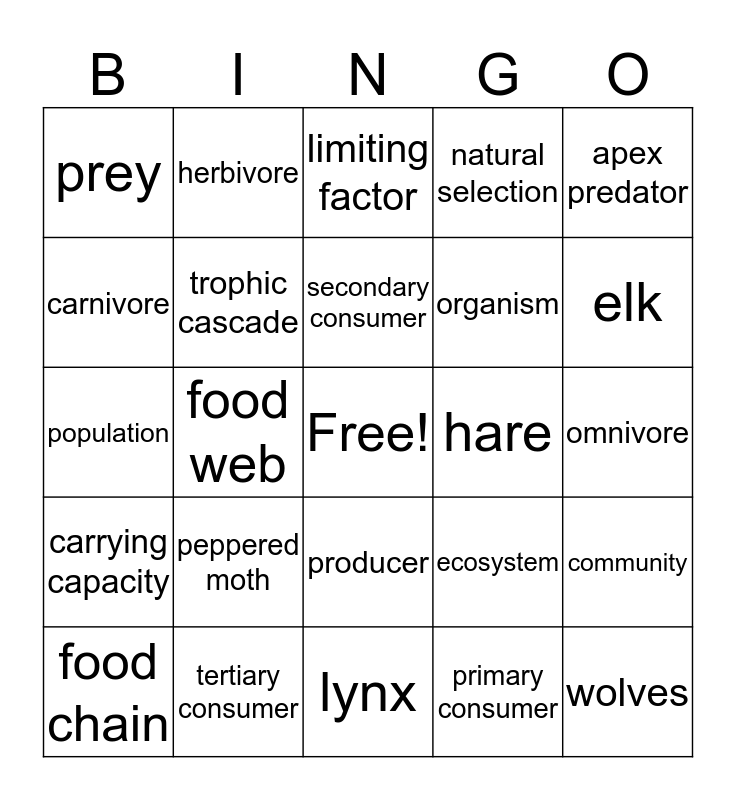 This bingo card has a free space and 26 words: producer, primary consumer, secondary consumer, tertiary consumer, apex predator, prey, carnivore, herbivore, omnivore, ecosystem, organism, population, community, food chain, food web, sun, natural selection, carrying capacity, limiting factor, wolves, elk, lynx, hare, peppered moth, trophic cascade and trophic pyramid.