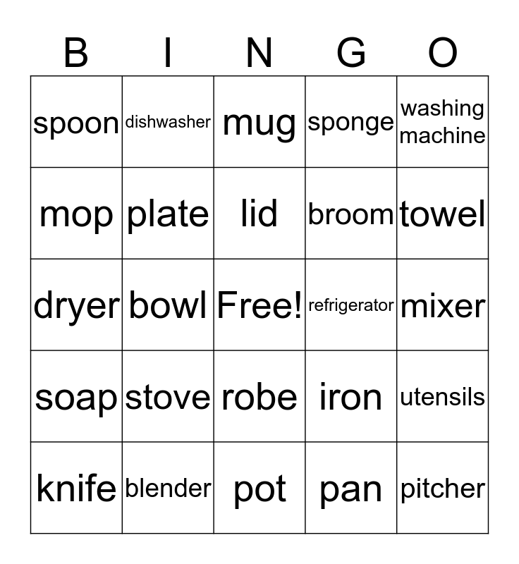 This bingo card has a free space and 29 words: knife, cup, bowl, fork, spoon, mug, plate, stove, refrigerator, blender, mixer, pitcher, pot, pan, towel, shower, robe, soap, washing machine, dryer, iron, bucket, broom, mop, sponge, dishwasher, utensils, lid and microwave.