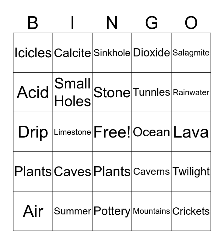 This bingo card has a free space and 24 words: Caves, Summer, Stone, Air, Salagmite, Icicles, Acid, Calcite, Ocean, Plants, Tunnles, Drip, Caverns, Twilight, Small Holes, Mountains, Lava, Sinkhole, Rainwater, Limestone, Crickets, Plants, Dioxide and Pottery.
