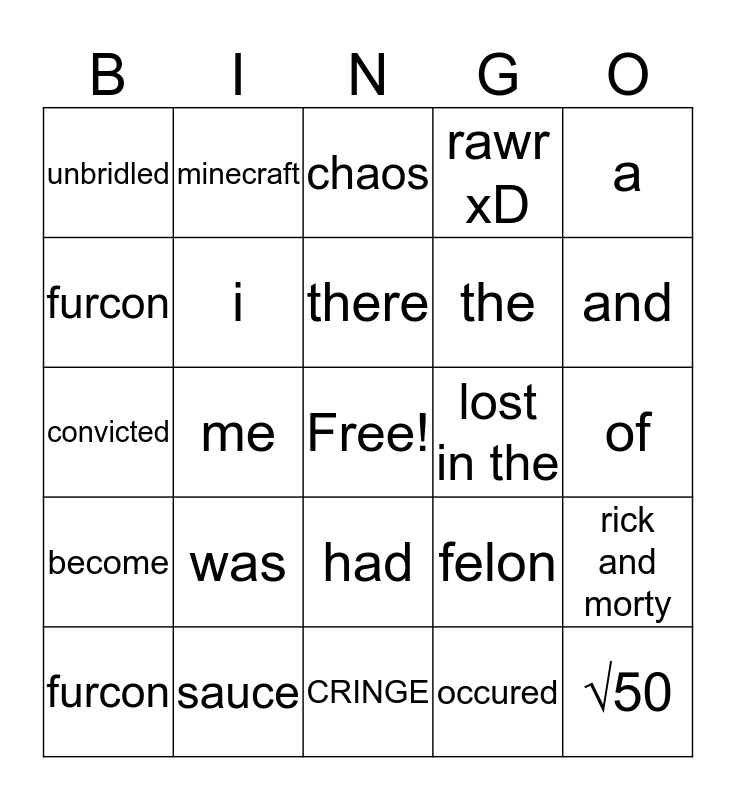 This bingo card has a free space and 29 words: furcon, brought, me, endless, unbridled, chaos, i, was, lost in the, sauce, of, √50, CRINGE, occured, and, i, had, become, a, convicted, felon, in, the, furcon, rawr xD, minecraft, rick and morty, there and losing.