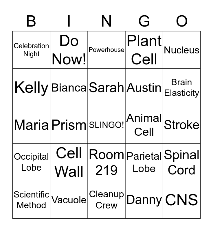 This bingo card has a free space and 44 words: The Brain, CNS, 5 Senses, Scientific Method, Hypothesis, Danny, Powerhouse, Lysosome, Nucleus, Vacuole, Plant Cell, Animal Cell, Room 219, Cell Wall, Cytoplasm, Cleanup Crew, ER, Maria, Nervous System, Brain Elasticity, Do Now!, Homework, Lesion, Celebration Night, 29th Summer, Stroke, Frontal Lobe, Temporal Lobe, Parietal Lobe, Occipital Lobe, Cerebellum, Spinal Cord, Hemisphere, Goggles, Prism, PJ, Kaitlyn, Jennifer, Sarah, Kelly, Austin, Amelia, Bianca and Cow's Eye.