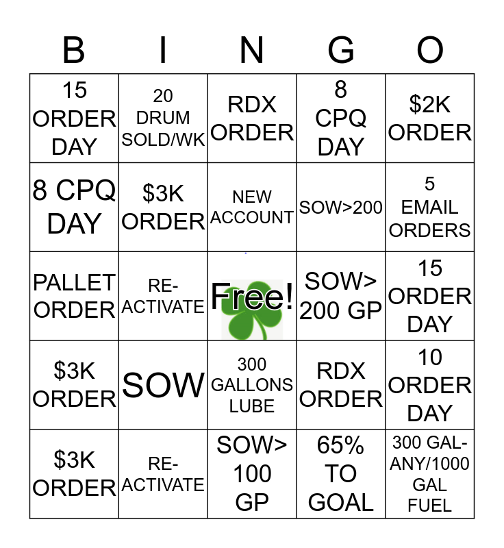 This bingo card has a free space and 24 words: SOW, RE-ACTIVATE, NEW ACCOUNT, $3K ORDER, $2K ORDER, 15 ORDER DAY, 8 CPQ DAY, 20 DRUM SOLD/WK, SOW> 200 GP, 300 GALLONS LUBE, SOW>200, PALLET ORDER, RDX ORDER, 10 ORDER DAY, $3K ORDER, 65% TO GOAL, 15 ORDER DAY, RDX ORDER, 5 EMAIL ORDERS, RE-ACTIVATE, 300 GAL-ANY/1000 GAL FUEL, $3K ORDER, 8 CPQ DAY and SOW> 100 GP.
