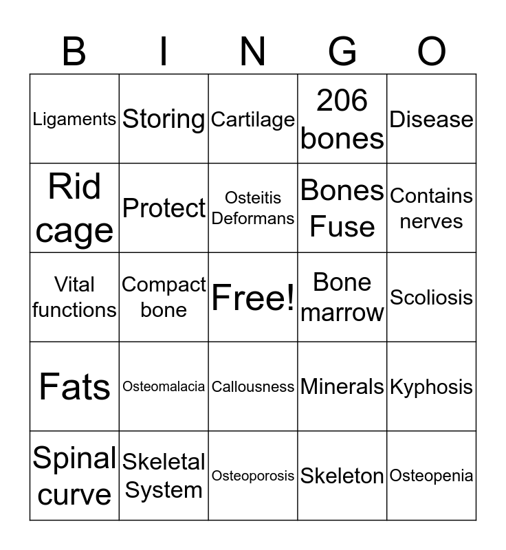 This bingo card has a free space and 30 words: Skeletal System, Tendons, Compact bone, Peritoneum, Ligaments, Cartilage, Protect, Callousness, Bone marrow, Osteoporosis, Scoliosis, Osteopenia, Skeleton, Spongy, Contains nerves, Red Blood cells, Minerals, Fats, Osteomalacia, Disease, Vital functions, Lordosis, Storing, Bones Fuse, Rid cage, 206 bones, Kyphosis, Spinal curve, Osteitis Deformans and White blood Cells.