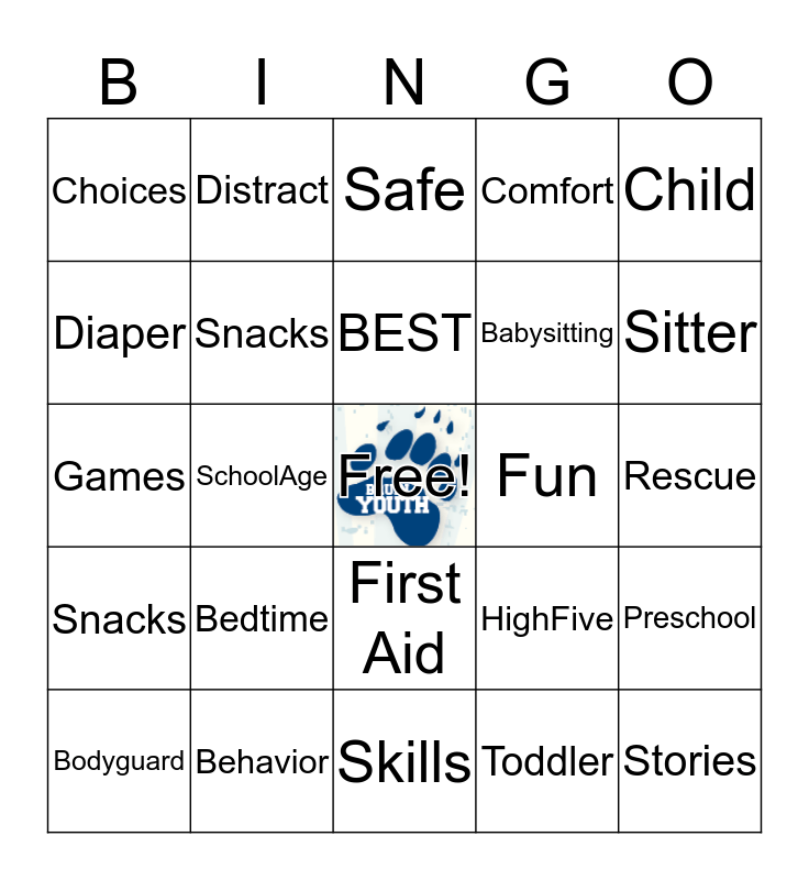 This bingo card has a free space and 24 words: Bedtime, Behavior, BEST, Bodyguard, Child, Choices, Diaper, Distract, Fun, First Aid, Babysitting, Games, HighFive, Preschool, Snacks, Toddler, Rescue, Safe, Sitter, SchoolAge, Stories, Snacks, Comfort and Skills.