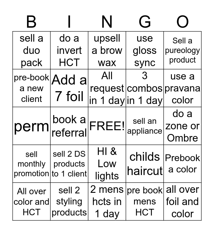 This bingo card has a free space and 24 words: sell 2 DS products to 1 client, sell 2 styling products, All request in 1 day, All over color and HCT, Sell a pureology product, sell a duo pack, pre-book a new client, do a invert HCT, sell an appliance, HI & Low lights, 3 combos in 1 day, perm, childs haircut, Prebook a color, Add a 7 foil, pre book mens HCT, do a zone or Ombre, upsell a brow wax, use a pravana color, book a referral, all over foil and color, sell monthly promotion, use gloss sync and 2 mens hcts in 1 day.
