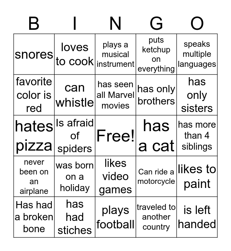 This bingo card has a free space and 29 words: Has had a broken bone, Is an only child, Is afraid of spiders, can use chopsticks, snores, plays a musical instrument, can whistle, was born on a holiday, has a cat, has had stiches, has more than 4 siblings, is left handed, plays football, traveled to another country, has only sisters, has a dog, likes video games, never been on an airplane, speaks multiple languages, hates pizza, Can ride a motorcycle, has an exotic pet, has only brothers, favorite color is red, puts ketchup on everything, loves to cook, likes to paint, has seen all Marvel movies and can sew.