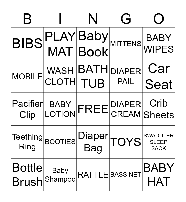 This bingo card has a free space and 48 words: ONESIE, BABY HAT, DIAPER BAG, RATTLE, BOOTIES, SOCKS, PLAY MAT, BOTTLES, MOBILE, HOODED TOWEL, WASH CLOTH, MITTENS, SWADDLER SLEEP SACK, TOYS, NAIL CLIPPER, NIGHT LIGHT, BATH TUB, DIAPER CREAM, BABY SHAMPOO, BABY WIPES, BABY LOTION, BASSINET, BIBS, DIAPER PAIL, Burp Cloth, Car Seat, Bottle Brush, Onsie, Diaper Bag, Teething Ring, Diapers, Plush Toy, Stroller, Booties, Baby Shampoo, Baby Shoes, Receiving Blanket, Crib Sheets, Crib Bumper, Bathtub, Handmade Blanket, Nursery Rhyme Book, Baby Book, Baby Brush, Pacifier Clip, Baby Nail Clippers, Baby Lotion and Toy Keys.