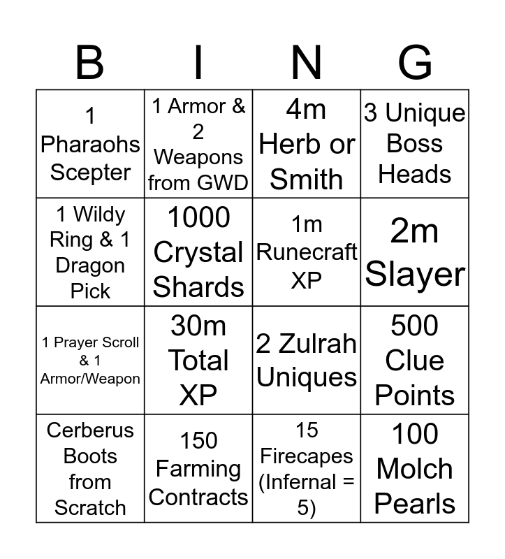 This bingo card has 16 words: 150 Farming Contracts, 500 Clue Points, 4m Herb or Smith, 1 Pharaohs Scepter, 1 Prayer Scroll & 1 Armor/Weapon, 1 Armor & 2 Weapons from GWD, 2 Zulrah Uniques, 15 Firecapes (Infernal = 5), 1 Wildy Ring & 1 Dragon Pick, 1000 Crystal Shards, Cerberus Boots from Scratch, 3 Unique Boss Heads, 30m Total XP, 2m Slayer, 1m Runecraft XP and 100 Molch Pearls.