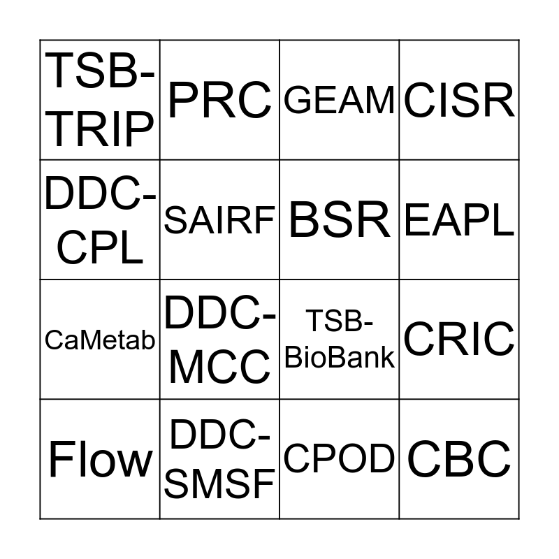 This bingo card has 16 words: DDC- SMSF, CRIC, GEAM, TSB- TRIP, CaMetab, PRC, TSB- BioBank, CPOD, DDC- CPL, SAIRF, Flow, CISR, DDC- MCC, EAPL, BSR and CBC.