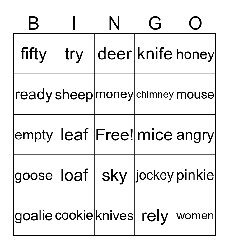 This bingo card has a free space and 26 words: sky, rely, money, cookie, honey, fifty, ready, try, angry, jockey, chimney, empty, pinkie, goalie, leaf, life, knife, goose, deer, women, mouse, knives, mice, loaf, sheep and geese.