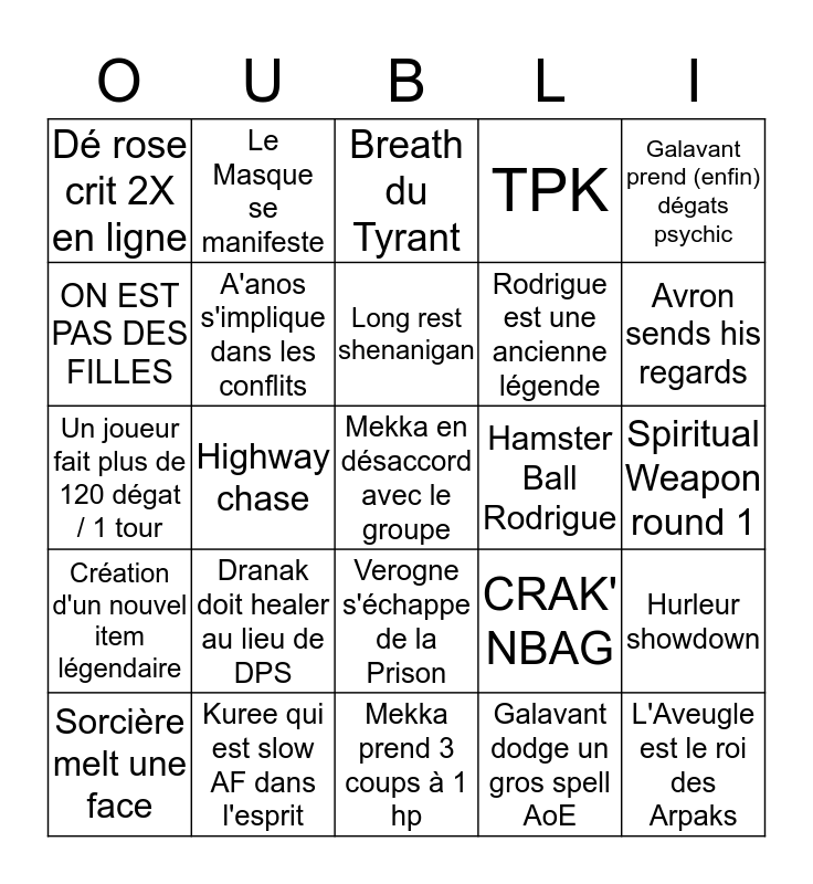 This bingo card has a free space and 24 words: Dranak doit healer au lieu de DPS, Kuree qui est slow AF dans l'esprit, Long rest shenanigan, Sorcière melt une face, Galavant prend (enfin) dégats psychic, Dé rose crit 2X en ligne, ON EST PAS DES FILLES, Le Masque se manifeste, Hamster Ball Rodrigue, Verogne s'échappe de la Prison, Rodrigue est une ancienne légende, Un joueur fait plus de 120 dégat / 1 tour, CRAK' NBAG, Hurleur showdown, A'anos s'implique dans les conflits, Galavant dodge un gros spell AoE, Spiritual Weapon round 1, Breath du Tyrant, Avron sends his regards, Highway chase, L'Aveugle est le roi des Arpaks, Création d'un nouvel item légendaire, TPK and Mekka prend 3 coups à 1 hp.