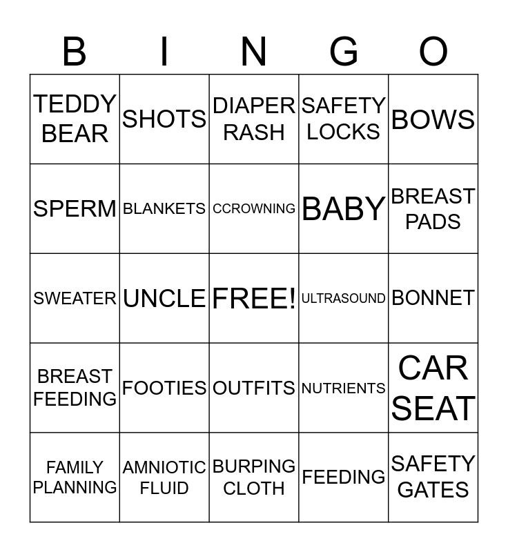 This bingo card has a free space and 35 words: BABY CLOTHES, BEDDING, BREECH, BLANKETS, OUTFITS, SAFETY LOCKS, SPERM, MOTHER, CCROWNING, CRIB MIRROR, SWEATER, BOWS, 2ND TRIMESTER, STORK, TEDDY BEAR, ULTRASOUND, FEEDING, UNCLE, BREAST FEEDING, SAFETY GATES, NUTRIENTS, FAMILY PLANNING, CAR SEAT, AMNIOTIC FLUID, DIAPER RASH, BREAST PADS, BRAXTON HICKS, TEETHER, BABY, BONNET, RATTLE, BURPING CLOTH, FOOTIES, SHOTS and BASSINET.