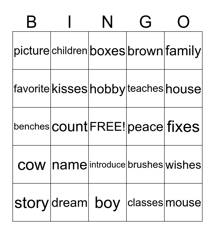 This bingo card has a free space and 24 words: name, dream, hobby, story, family, picture, favorite, children, peace, introduce, teaches, benches, brushes, wishes, kisses, classes, fixes, boxes, house, count, mouse, cow, brown and boy.