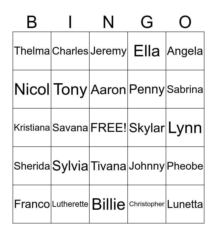 This bingo card has a free space and 24 words: Sylvia, Lutherette, Aaron, Franco, Angela, Thelma, Nicol, Charles, Skylar, Tivana, Penny, Kristiana, Johnny, Pheobe, Tony, Christopher, Lynn, Jeremy, Sabrina, Savana, Lunetta, Sherida, Ella and Billie.