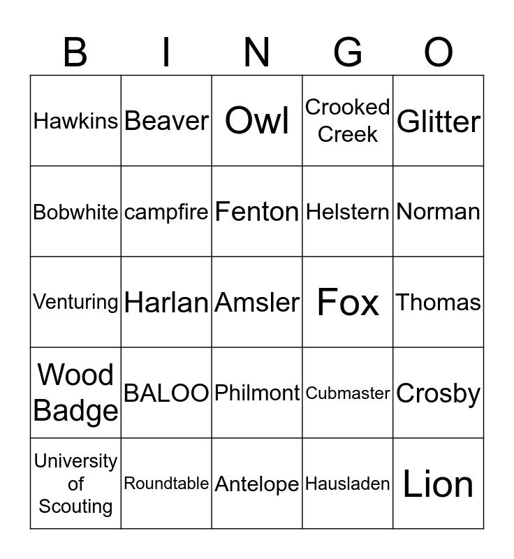 This bingo card has 50 words: Free!, Amsler, An Hour a Week, Antelope, BALOO, Bear, Beaver, Bobcat, Bobwhite, Buffalo, campfire, Crooked Creek, Crosby, Cubmaster, Day Camp, Eagle, Fenton, Fox, Friends of Scouting, Glitter, Harlan, Hausladen, Hawkins, Helstern, Lincoln Heritage Council, Lion, Norman, NYLT, Owl, Philmont, Pierce, Pinewood Derby, Ribar, Ricker, Roundtable, Roundup, Scout Master, Silver Beaver, Snakes, Thomas, Tiger, Todd, Tunnel Mill, Unit Commissioner, University of Scouting, Venturing, Webelos, Wolf, Wood Badge and Zehnder.