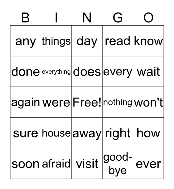 This bingo card has a free space and 24 words: house, afraid, does, soon, know, any, done, things, nothing, away, every, again, right, how, everything, good-bye, won't, day, wait, were, ever, sure, read and visit.