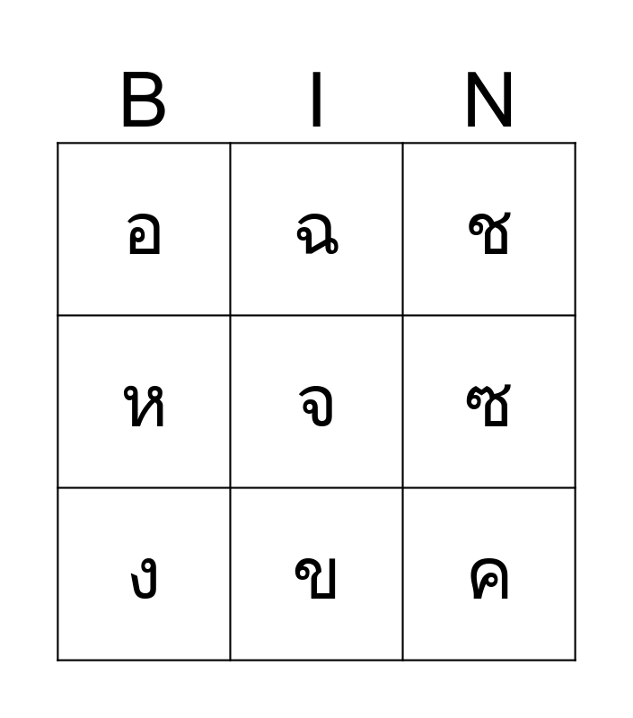 This bingo card has a free space and 11 words: ก, ข, ค, ง, ฉ, ช, ซ, ฌ, ห, อ and ฮ.