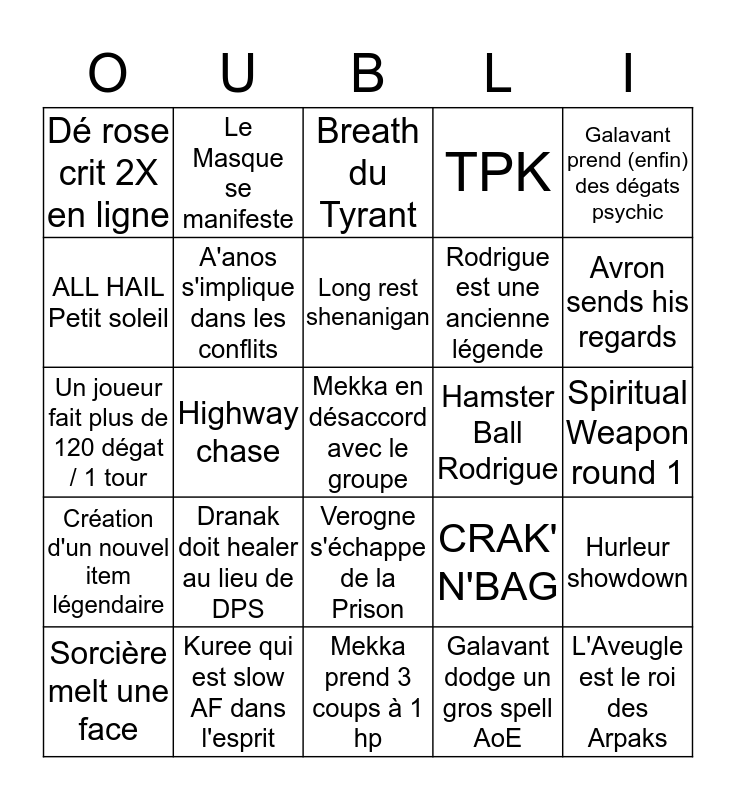This bingo card has a free space and 24 words: Dranak doit healer au lieu de DPS, Kuree qui est slow AF dans l'esprit, Long rest shenanigan, Sorcière melt une face, Galavant prend (enfin) des dégats psychic, Dé rose crit 2X en ligne, ALL HAIL Petit soleil, Le Masque se manifeste, Hamster Ball Rodrigue, Verogne s'échappe de la Prison, Rodrigue est une ancienne légende, Un joueur fait plus de 120 dégat / 1 tour, CRAK' N'BAG, Hurleur showdown, A'anos s'implique dans les conflits, Galavant dodge un gros spell AoE, Spiritual Weapon round 1, Breath du Tyrant, Avron sends his regards, Highway chase, L'Aveugle est le roi des Arpaks, Création d'un nouvel item légendaire, TPK and Mekka prend 3 coups à 1 hp.