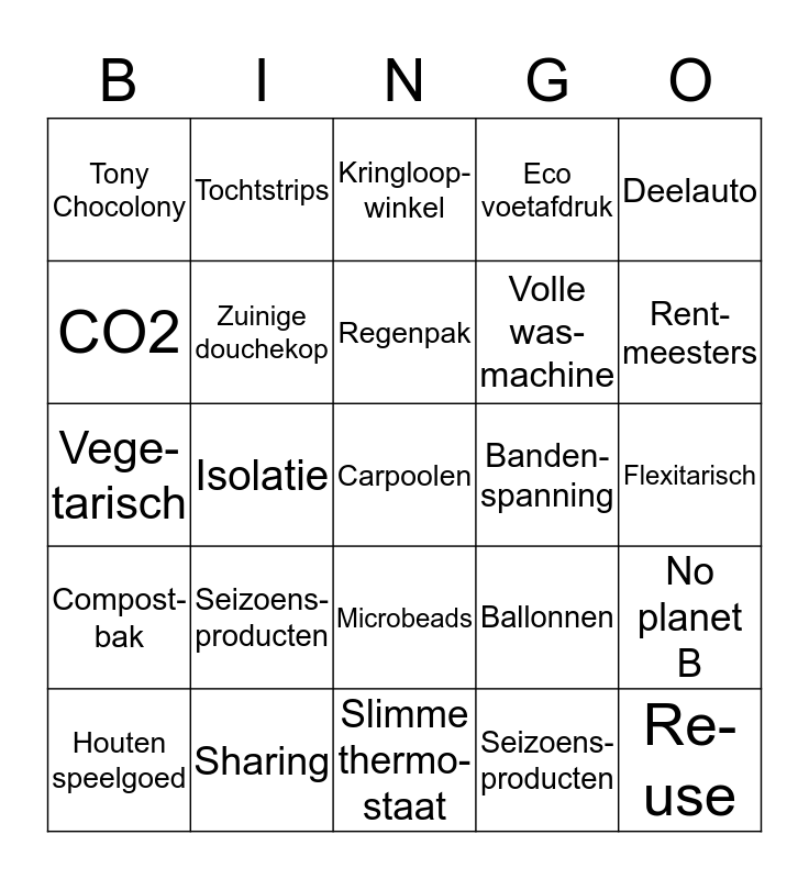 This bingo card has 60 words: Refuse, Sharing, Repaircafe, Compost-bak, Seizoens-producten, Insecten-hotel, Zuinige douchekop, Samen douchen, Volle was-machine, Fairtrade, Eco voetafdruk, Plastic soep, CO2, Timer in douche, Biologisch, Tony Chocolony, Carpoolen, Deelauto, OV: ja!, Regenpak, Banden-spanning, Kringloop-winkel, Houten speelgoed, No planet B, Fietsen, Zonne-panelen, Klimaatver-andering, Milieuver-vuiling, Rent-meesters, Tochtstrips, Zonne-panelen, Klimaatver-andering, Milieu-vervuiling, Rent-meesters, Tochtstrips, Groene stroom, Tweede-hands, Isolatie, Consump-tiemaat-schappij, Vege-tarisch, Vlieg-schaamte, Seizoens-producten, Flexitarisch, Circulair, Ballonnen, Zwerfafval, Recycling, Elektrische auto, WC kort spoelen, Microbeads, Slimme thermo-staat, Windmolen, Slow fashion, Refur-bished, THT datum, Kleine borden, Broeikas effect, Neder-landse pro-ducten, Re-use and Ontspullen.