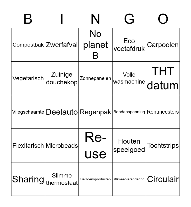 This bingo card has 55 words: Refuse, Sharing, Repaircafe, Compostbak, Seizoensproducten, Insectenhotel, Zuinige douchekop, Samen douchen, Volle wasmachine, Fairtrade, Eco voetafdruk, Plastic soep, CO2, Timer in douche, Biologisch, Tony Chocolony, Carpoolen, Deelauto, OV: ja!, Regenpak, Bandenspanning, Kringloopwinkel, Houten speelgoed, No planet B, Fietsen, Zonnepanelen, Klimaatverandering, Milieuvervuiling, Rentmeesters, Tochtstrips, Groene stroom, Tweedehands, Isolatie, Consumptiemaatschappij, Vegetarisch, Vliegschaamte, Seizoensproducten, Flexitarisch, Circulair, Ballonnen, Zwerfafval, Recycling, Elektrische auto, WC kort spoelen, Microbeads, Slimme thermostaat, Windmolen, Slow fashion, Refurbished, THT datum, Kleine borden, Broeikas effect, Nederlandse producten, Re-use and Ontspullen.