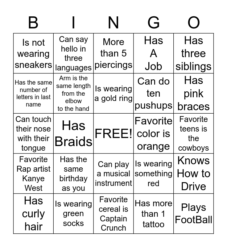 This bingo card has a free space and 24 words: Has the same birthday as you, Is wearing green socks, Is wearing a gold ring, Has curly hair, Has three siblings, Is not wearing sneakers, Has the same number of letters in last name, Can say hello in three languages, Favorite color is orange, Can play a musical instrument, Can do ten pushups, Can touch their nose with their tongue, Is wearing something red, Knows How to Drive, Arm is the same length from the elbow to the hand, Has more than 1 tattoo, Favorite teens is the cowboys, More than 5 piercings, Has pink braces, Has Braids, Plays FootBall, Favorite Rap artist Kanye West, Has A Job and Favorite cereal is Captain Crunch.
