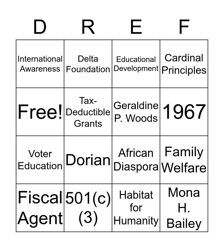 This bingo card has 16 words: 501(c)(3), Family Welfare, Educational Development, International Awareness, Voter Education, Delta Foundation, African Diaspora, Habitat for Humanity, Free!, Tax-Deductible Grants, Fiscal Agent, Cardinal Principles, Dorian, 1967, Geraldine P. Woods and Mona H. Bailey.