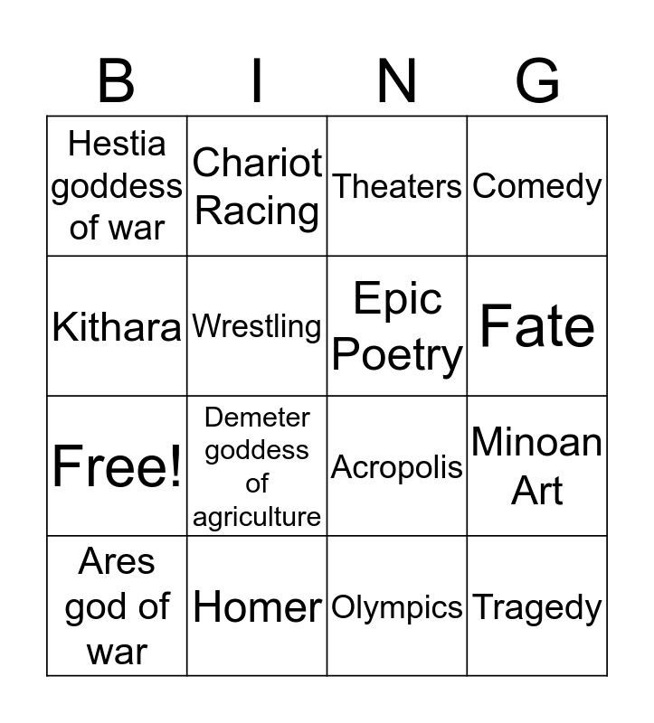This bingo card has 20 words: Minoan Art, Scuplting, Theaters, Festivals in honor of the gods, Ares god of war, Kithara, Homer, Hestia goddess of war, Free!, Chariot Racing, Demeter goddess of agriculture, Acropolis, Wrestling, Tragedy, Epic Poetry, Boxing, Fate, Comedy, Olympics and Aulos.