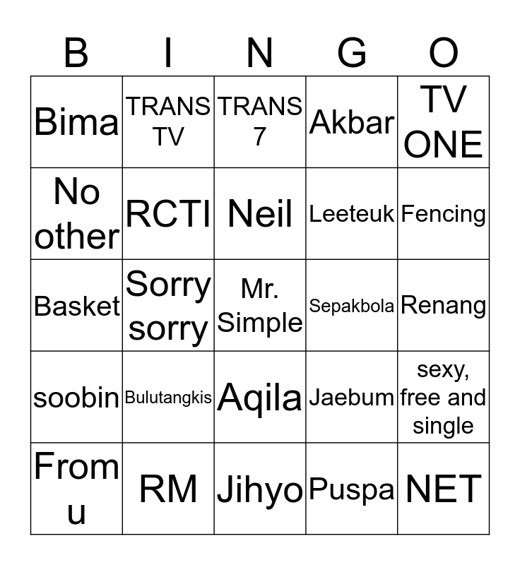 This bingo card has a free space and 24 words: Bulutangkis, RM, Neil, From u, TV ONE, Bima, No other, TRANS TV, Sepakbola, Aqila, Leeteuk, Basket, Jaebum, sexy, free and single, RCTI, Puspa, Renang, TRANS 7, Fencing, Sorry sorry, NET, soobin, Akbar and Jihyo.