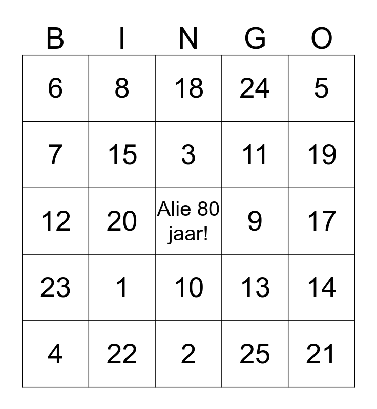 This bingo card has a free space and 25 words: 1, 2, 3, 4, 5, 6, 7, 8, 9, 10, 11, 12, 13, 14, 15, 16, 17, 18, 19, 20, 21, 22, 23, 24 and 25.