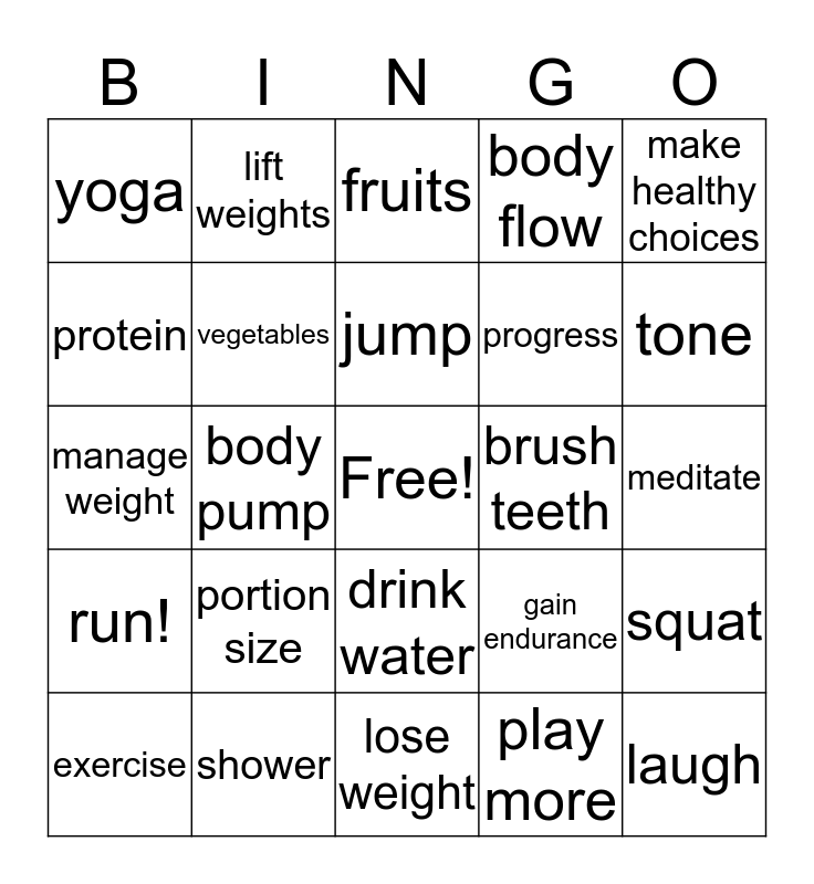 This bingo card has a free space and 29 words: exercise, cycling, body pump, diet, yoga, fruits, vegetables, portion size, brush teeth, shower, meditate, laugh, lose weight, play more, tone, feel proud, drink water, run!, make healthy choices, manage weight, gain endurance, cook at home, progress, protein, body flow, lift weights, squat, jump and quit smoking.