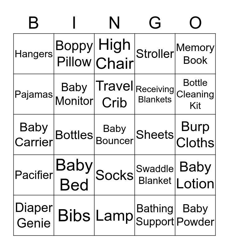 This bingo card has 40 words: Diaper Bag, Baby Carrier, Car Seat, Baby Monitor, Bibs, Socks, Travel Crib, Night Light, Memory Book, Pacifier, Bottles, Stroller, Baby Bouncer, Burp Cloths, Sheets, Baby Bed, Stuffed Animal, Hangers, Rattle, High Chair, Baby Lotion, Bathing Support, Receiving Blankets, Pajamas, Onesies, Humidifier, Teething Rings, Hooded Towel, Baby Powder, Quilt, Baby Wipes, Diaper Genie, Play Gym, Swaddle Blanket, Bottle Cleaning Kit, Lamp, Baby Spoons, Baby Plate/Bowl, Boppy Pillow and Bath Toys.