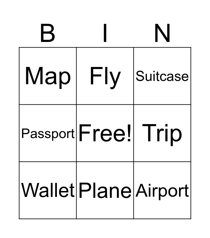This bingo card has a free space and 10 words: Plane, Suitcase, Map, Airport, Passport, Wallet, Fly, Ticket, Trip and Visit.
