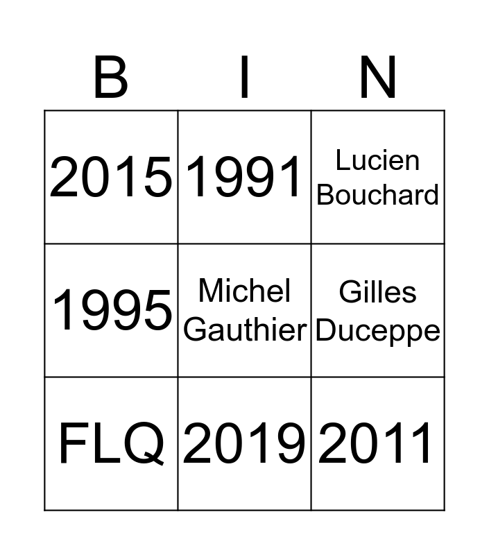 This bingo card has 9 words: FLQ, Lucien Bouchard, 1991, 1995, 2015, Gilles Duceppe, Michel Gauthier, 2011 and 2019.
