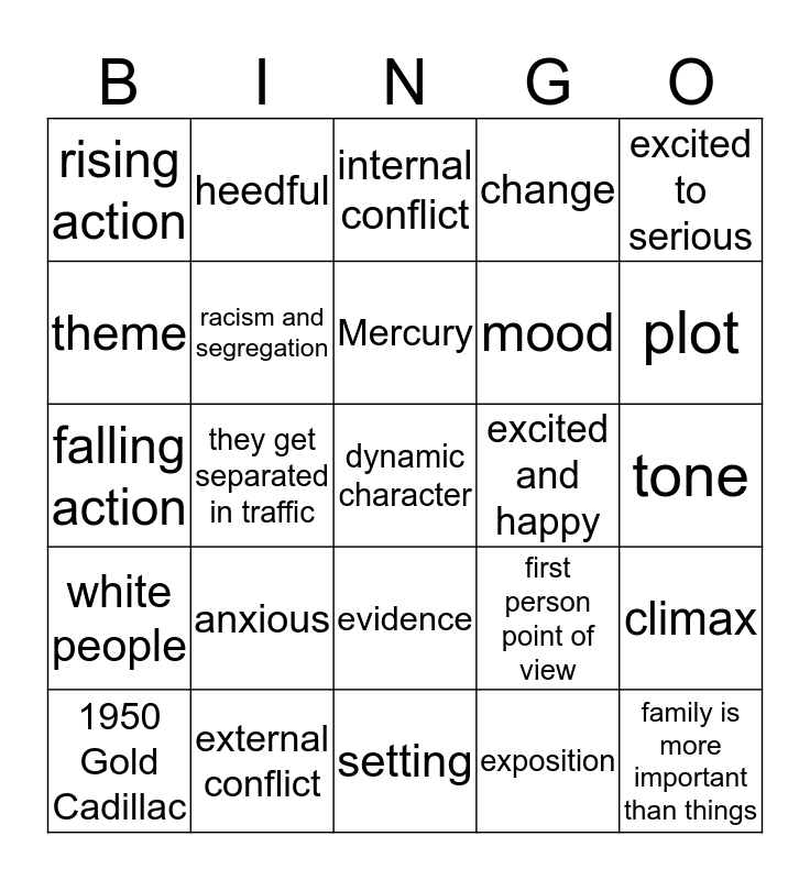 This bingo card has a free space and 39 words: Toledo, Ohio, duplex, stealing the Gold Cadillac, racism and segregation, 1950 Gold Cadillac, evidence, Mercury, from happy and joking to worried, excited to serious, white people, they get separated in traffic, change, family is more important than things, tone, excited and happy, anxious, novella, rising action, resolution, first person point of view, theme, setting, mood, plot, rural, unison, evident, dusk, lurked, heedful, caravan, lynch, internal conflict, external conflict, exposition, conflict, climax, falling action and proud, daring, and caring.