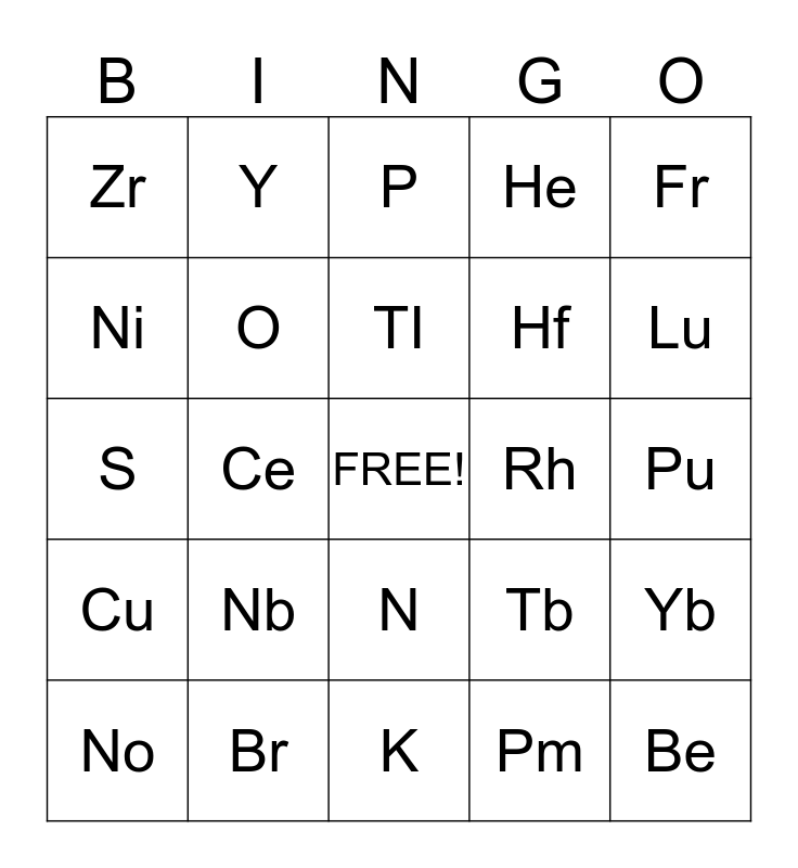 This bingo card has a free space and 24 words: Nb, Br, TI, No, Fr, Zr, Ni, Y, Rh, N, Hf, S, Tb, Yb, O, Pm, Pu, P, Lu, Ce, Be, Cu, He and K.