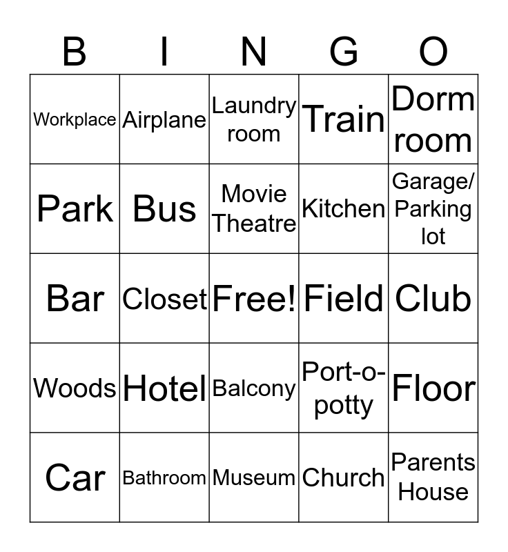 This bingo card has a free space and 24 words: Car, Hotel, Movie Theatre, Church, Dorm room, Workplace, Airplane, Laundry room, Field, Club, Bar, Bus, Port-o-potty, Floor, Park, Bathroom, Museum, Train, Garage/ Parking lot, Woods, Closet, Balcony, Kitchen and Parents House.