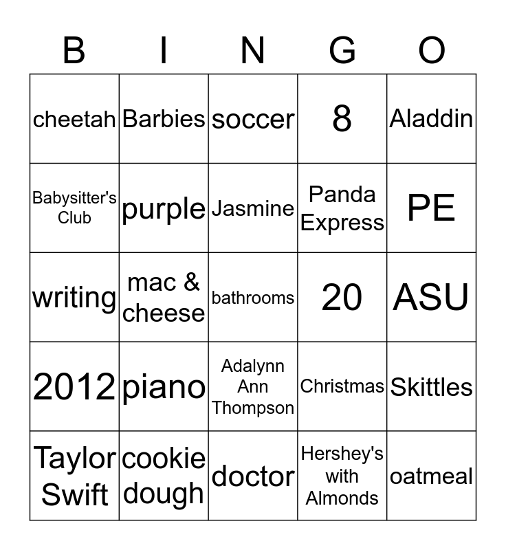 This bingo card has a free space and 24 words: piano, cookie dough, Jasmine, Taylor Swift, Aladdin, cheetah, Babysitter's Club, Barbies, 20, Adalynn Ann Thompson, Panda Express, writing, Christmas, Skittles, purple, Hershey's with Almonds, ASU, soccer, PE, mac & cheese, oatmeal, 2012, 8 and doctor.